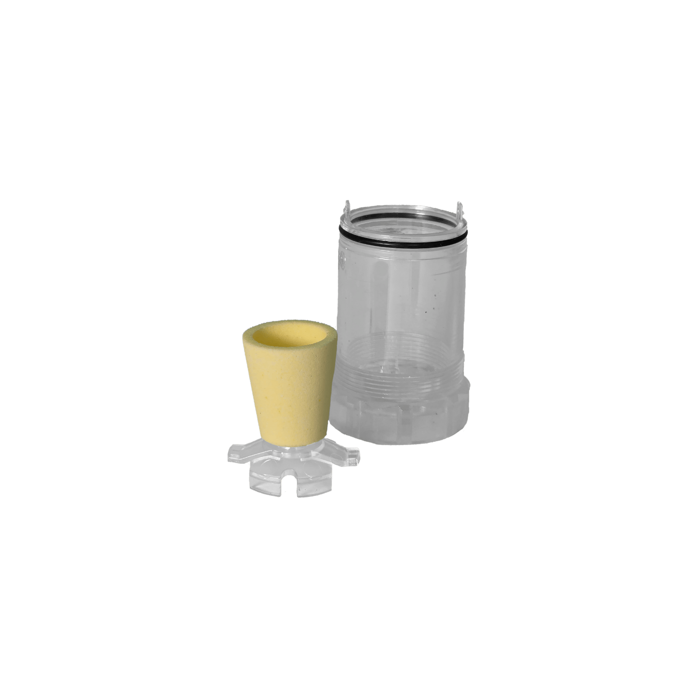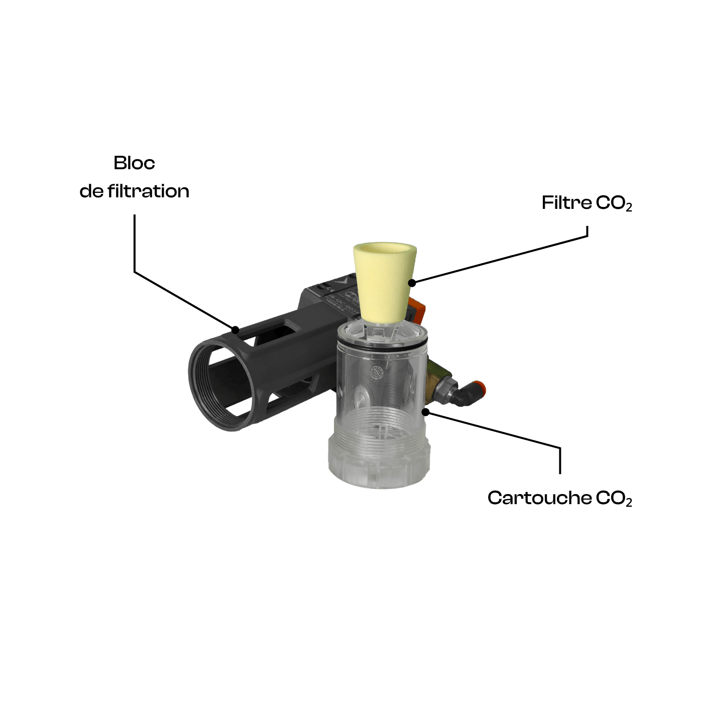 Le cône jaune situé au sommet de cette cartouche correspond au filtre CO₂. Il se retire et se fixe facilement en appuyant sur les tiges de maintien.