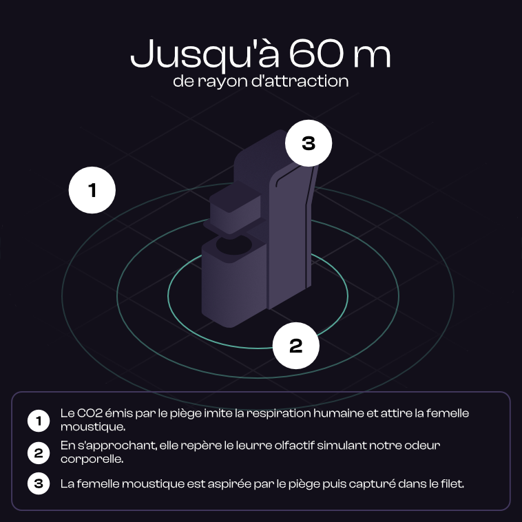 Elle reproduit la présence humaine pour attirer et capturer les moustiques. Le piège doit donc être positionné à distance afin de ne pas ramener les moustiques sur vous.
